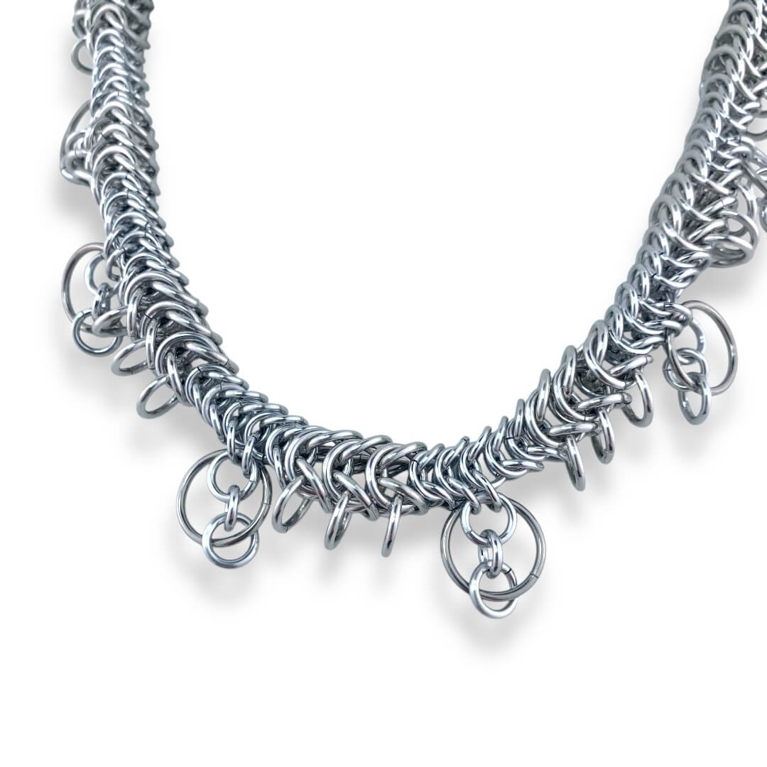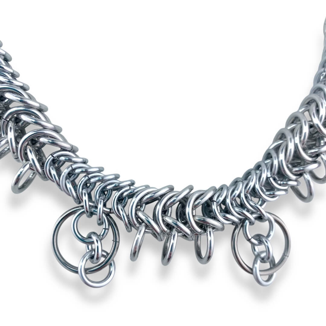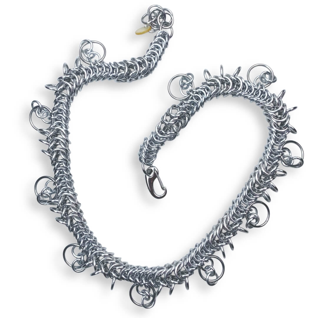 ⢠Hypoallergenic, durable, locally sourced mix of metal rings to balance the brillance and weight : bright and anodized alluminium and stainless steel rings